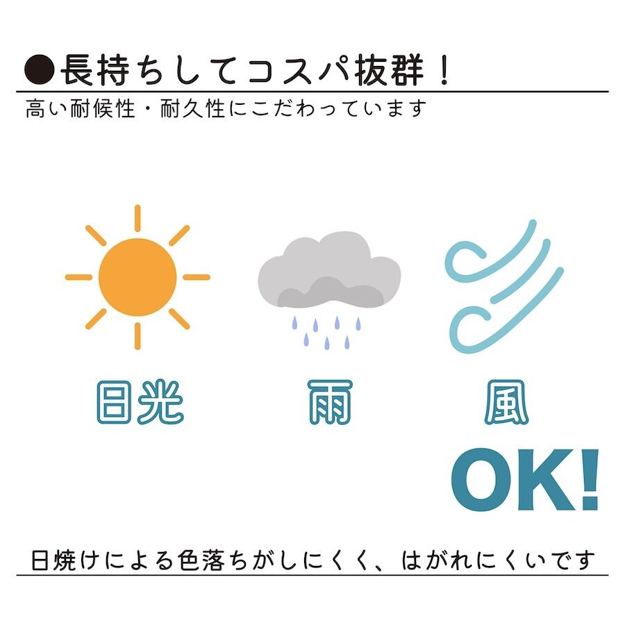 自社スクリーン印刷にて作成している商品ですので、屋外での利用もOKで、耐候・耐水性もバッチリ、日焼けによる色あせ・傷や汚れにも強く丈夫で長持ちします。