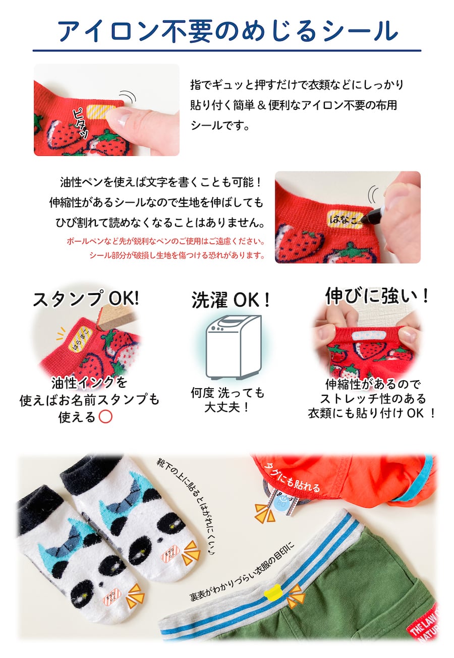 <サイズ> ●本体サイズ 幅 10.1cm 高さ 8.9cm ●絵柄サイズ 幅 1.9cm 高さ 0.9cm <商品説明> ●めじるシール サッカー全8色 1.オレンジ 2.イエロー 3.グリーン 4.ブルー 5.パープル 6.ピンク 7.レッド 8.グレー ・お子様の靴下や衣服、介護施設への入居・入院の際の名入れ・仕分けに便利です。 ・マスクの仕分けにも使用いただけます。 ・家族の仕分け問題も一発解消。 ・目印に最適です。 ・お子様が一人でズボンが履けるように、前後の目印としてもいかがでしょうか。 アイロンを使わず、こすって接着させる新しいタイプのシールです。【ノンアイロン】 伸縮性があるので、伸びるタイプの素材にも貼れます。 洋服はもちろん、バッグなどの布製品のほか、レインウェアなどアイロンを使用できない素材にもお使いいただけます。 高熱を発するアイロンを使わないことから、小さなお子様がいるご家庭でも安心してお使いいただけます。 もちろん洗濯しても大丈夫です。 <注意事項> ※文字を書く際は油性ペンでお書きください。 ※ボールペンなどの先端が鋭利なペンの使用はご遠慮ください。シール部分が破損する恐れがあります。 ※乾燥機は使用しないでください。(はがれの原因になります) ※漂白剤は使用しないでください。(色落ちの原因になります) ※ドライクリーニングは使用しないでください。 ※強い摩擦により、はがれが生じることがございますので、摩擦が強い箇所はお控えください。 ※お使いの環境(機種、OS、ブラウザ、ディスプレイ設定)等により、多少の色味の違いが出る場合がございますので予めご了承下さい。